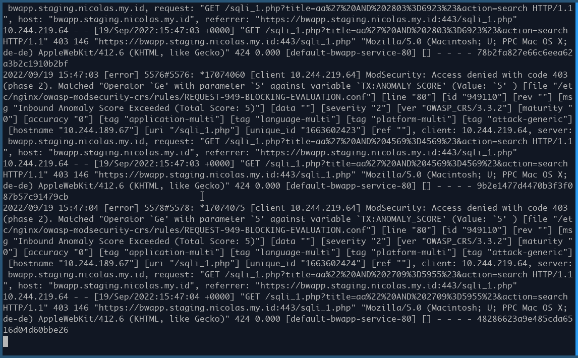 - Penampakan logs yang masuk ke ingress ketika aplikasi web tersebut mendapat percobaan serangan SQL Injection. Semua request yang dianggap abusive diblok oleh ModSecurity.