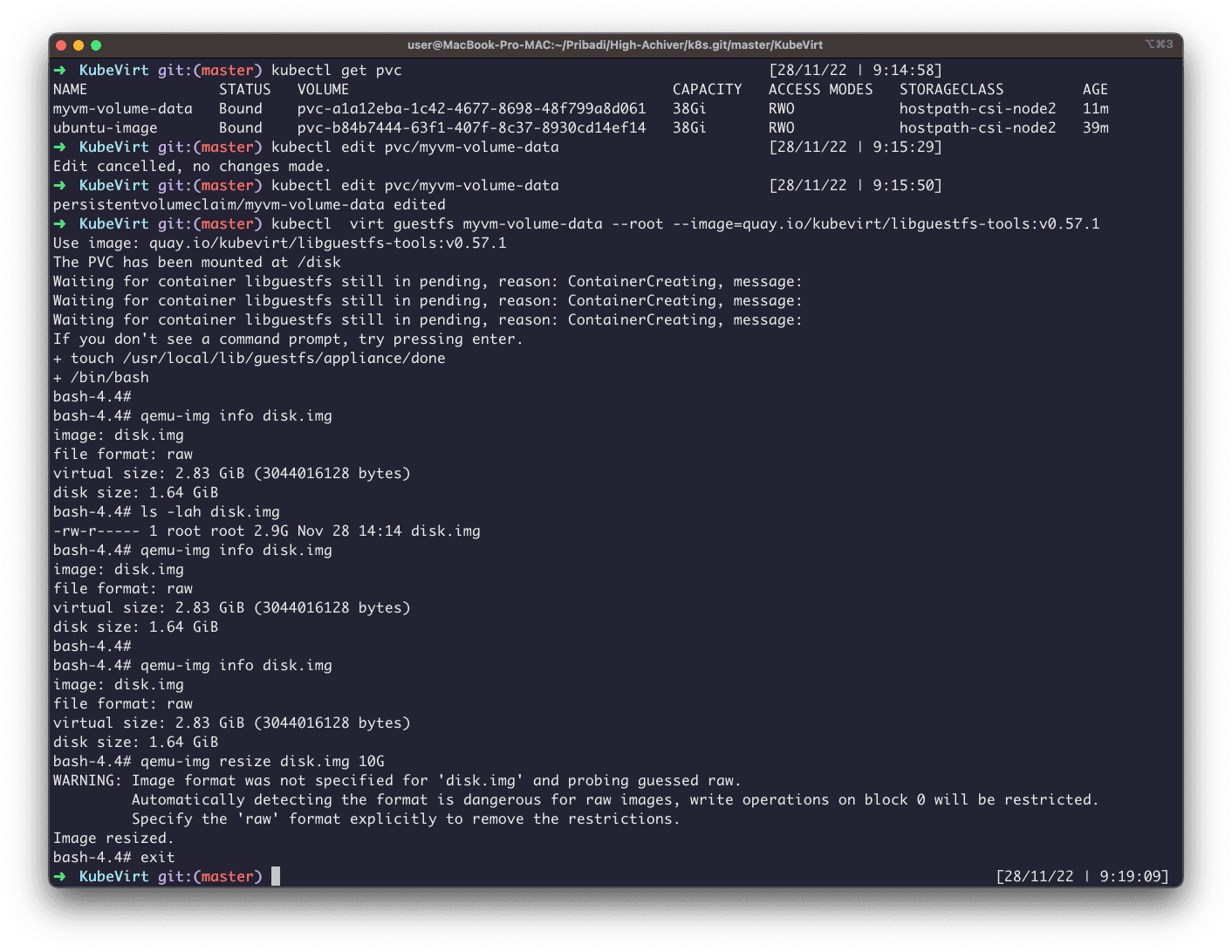 In this case, resize disk become tricky, because hostpath-provisioner is different than real storage cluster like Rook, longhorn. So we need to scale image manualy with qemu-img comand